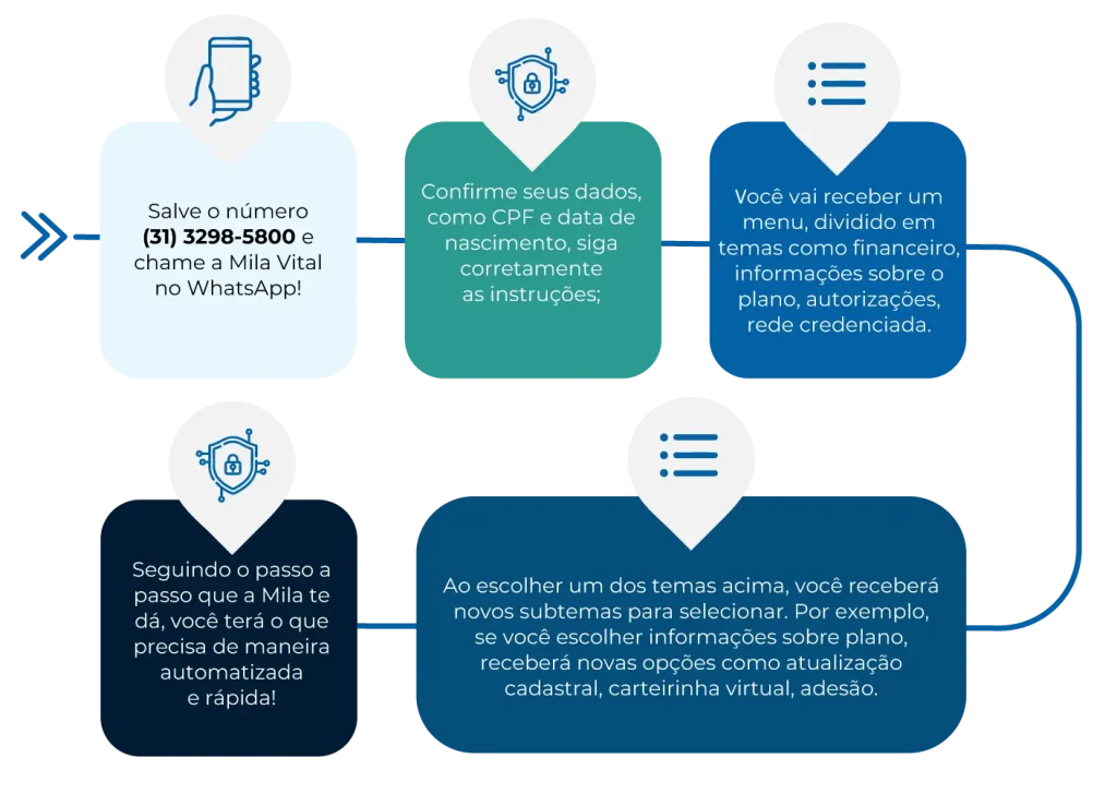 Com a Mila Vital, pelo WhatsApp, nossos beneficiários têm acesso rápido a serviços automatizados, 24 horas por dia: carteirinha digital, boletos, extratos, informe de pagamentos para imposto de renda, consulta de autorizações e formulários e documentos de reembolso.